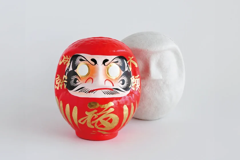 高崎だるまの起源は諸説あるが、今から200年以上前に豊岡村(現在の高崎市)の豪農、山縣友五郎によって生み出されたとされる。明治時代に入り、木型名人の葦名鉄十郎盛幸がこの地でだるまの木型を専門に彫り始めると、徐々にだるまづくりを目指す者が増えていった。現在、72人の職人がその伝統を受け継ぎ、全国の張り子だるまの8割がここでつくられている。