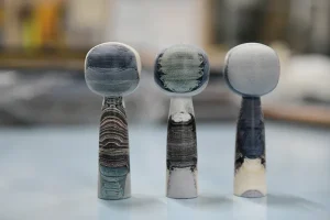 ニューノスのこけし。塊から削り出してつくる。両手に収まるミニマムサイズで、他の製品をつくった端材からも削り出せる。