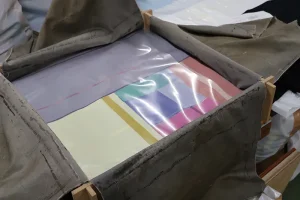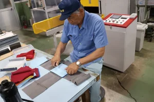 同時に、廃棄物として処分することで生じる環境負荷や資源損失を防ぎたいという思いもあり、セイショクは「色を活かせるリサイクル方法」を模索し始める。そして岡山県工業技術センター協力のもと、何百枚もの生地の間に樹脂フィルムを挟み込み、熱と圧力で押し潰して板のようにする積層技術を開発した。当時のことを社長の姫井氏は次のように語る。