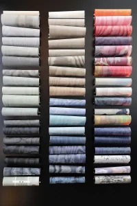 ニューノスのサンプル展示。原材料の布の色・柄・厚さ等によって様々な色味になる。